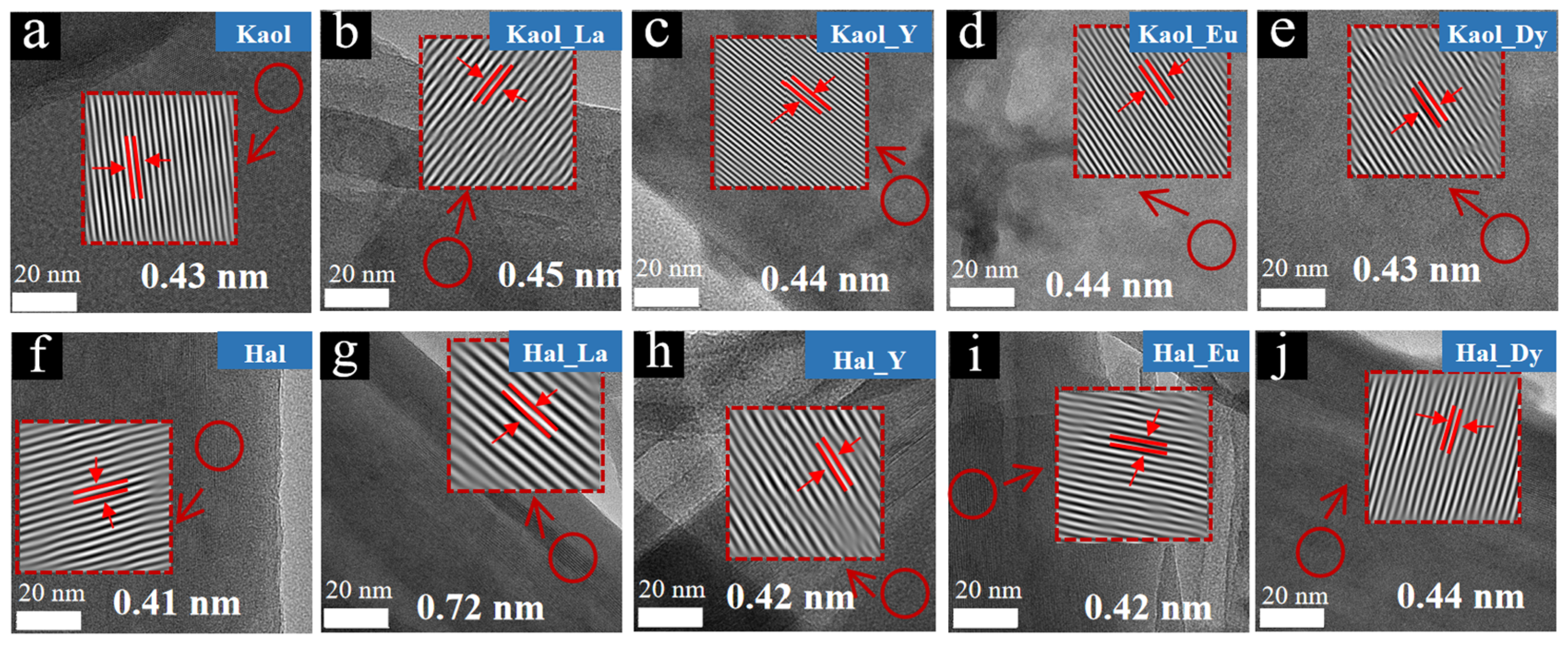HRTEM images of pristine kaolinite (a) and kaolinite after adsorption of La3+ (b), Y3+ (c), Eu3+ (d) and Dy3+ (e); HRTEM images of pristine halloysite (f) and halloysite after adsorption of La3+ (g), Y3+ (h), Eu3+ (i) and Dy3+ (j).
