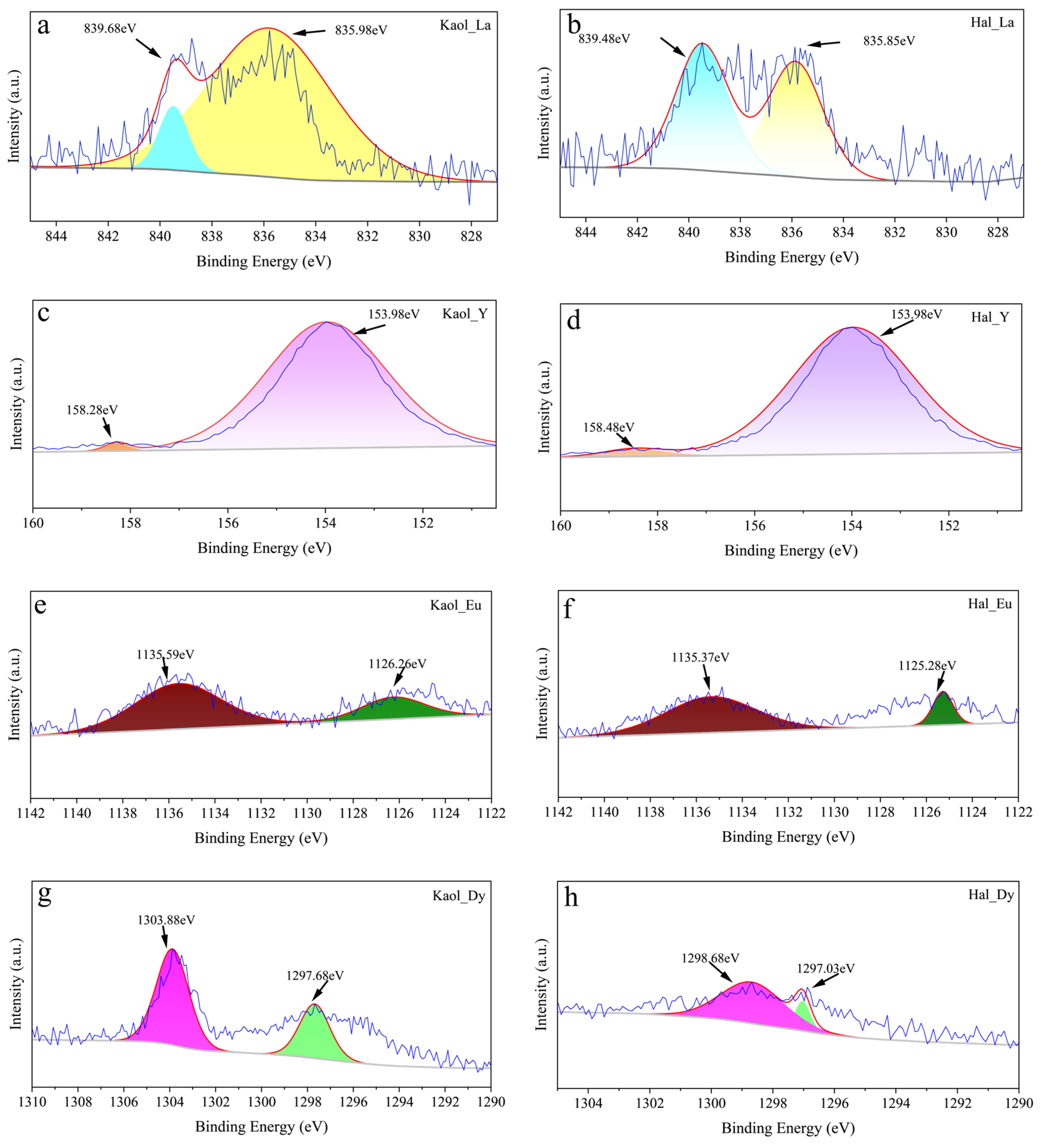 REE 3d5/2 XPS spectra of kaolinite (a,c,e,g) and halloysite (b,d,f,h) after the adsorption of La3+ (a,b), Y3+ (c,d), Eu3+ (e,f) and Dy3+ (g,h). (dark blue line: raw data, red line: fitted data, Blue, yellow, orange, purple, brown, dark green, dark purple, and green represent the fitting peaks of La3+, Y3+, Eu3+, and Dy3+ rare earth ions on kaolinite and halloysite, respectively.)