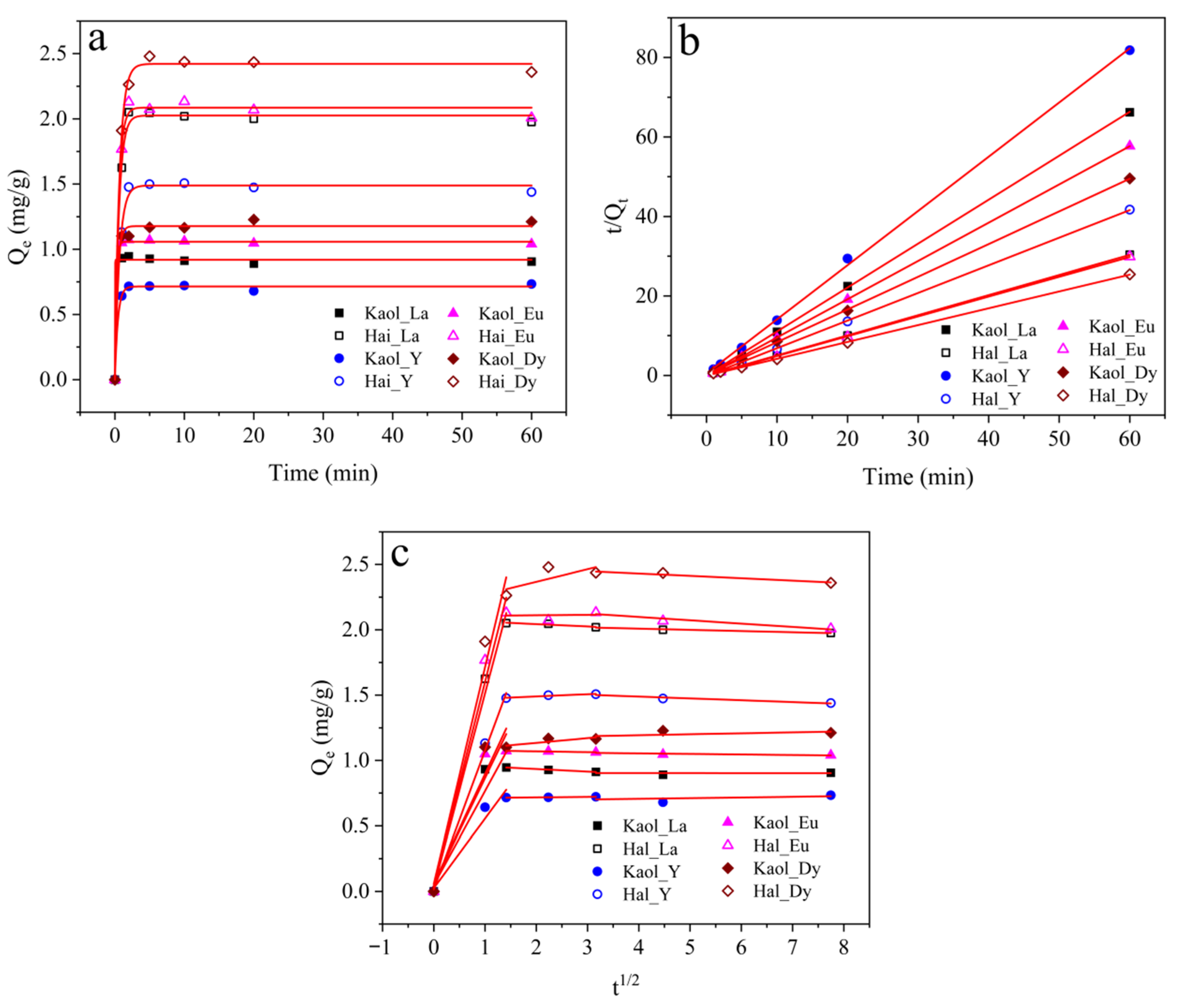 Pseudo-first-order kinetic model (a), pseudo-first-order kinetic model (b), internal diffusion model (c) of La3+, Y3+, Eu3+, and Dy3+ ions adsorbed by kaolinite and halloysite.