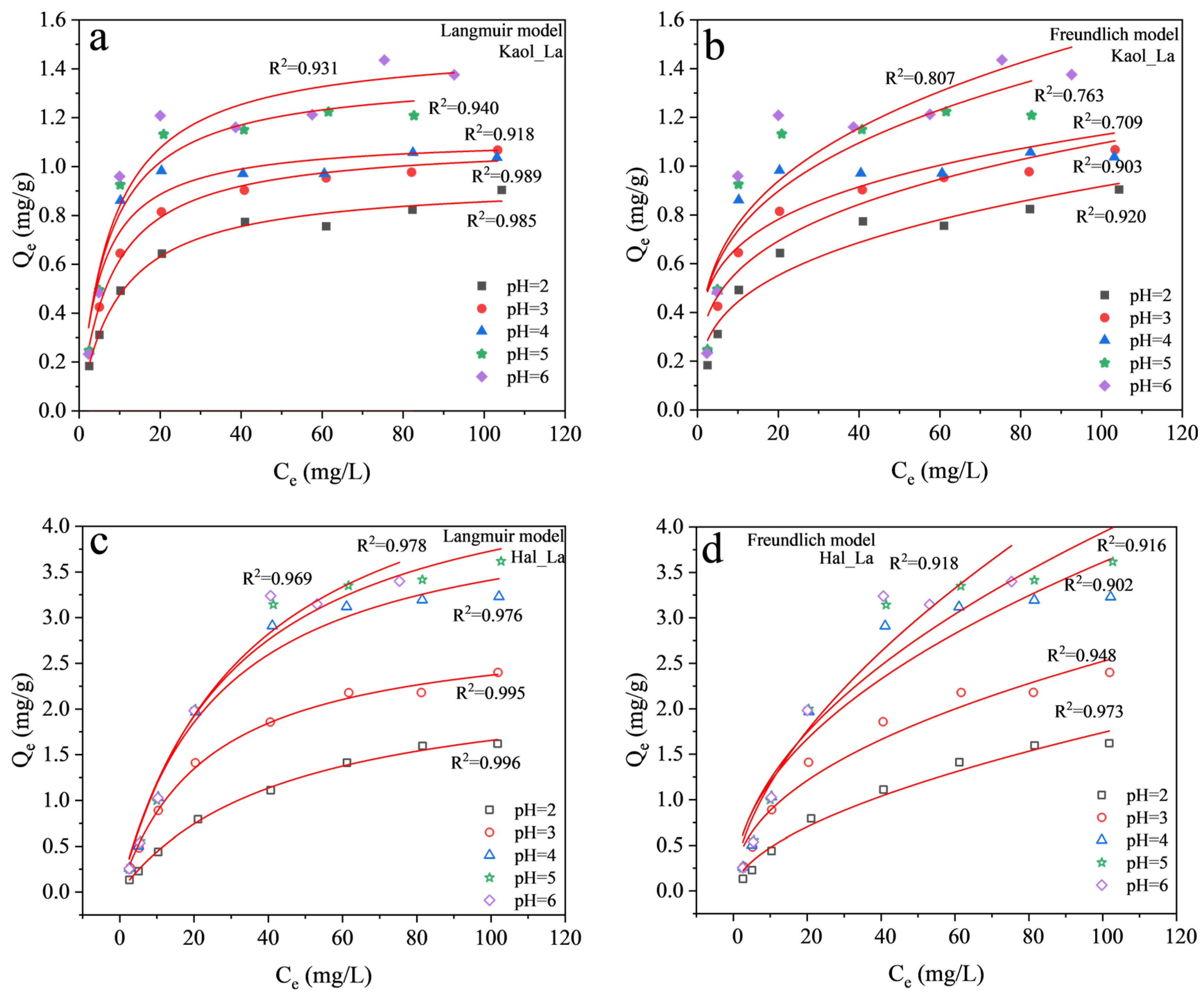 Isothermal adsorption curves fitted by the Langmuir model (a,c) and Freundlich model (b,d) for La3+ adsorption on kaolinite (a,b) and halloysite (c,d) at different pH values (2.0, 3.0, 4.0, 5.0, and 6.0).