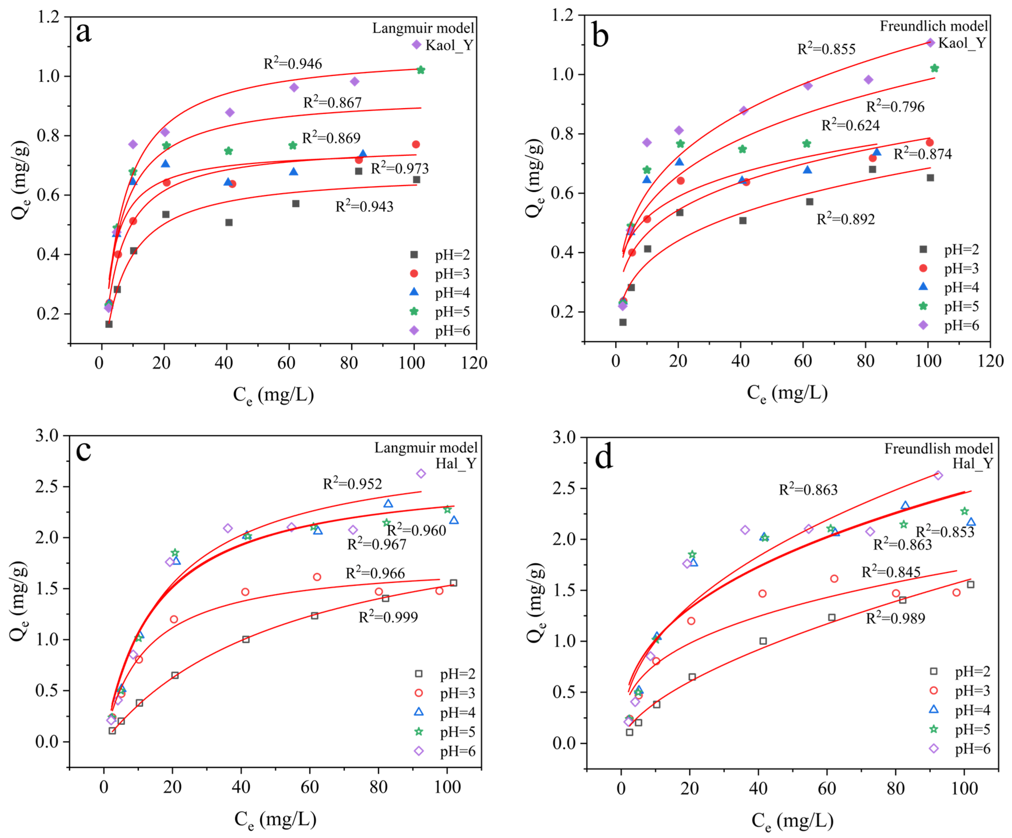 Isothermal adsorption curves fitted by the Langmuir model (a,c) and Freundlich model (b,d) for Y3+ adsorption on kaolinite (a,b) and halloysite (c,d) at different pH values (2.0, 3.0, 4.0, 5.0, and 6.0).