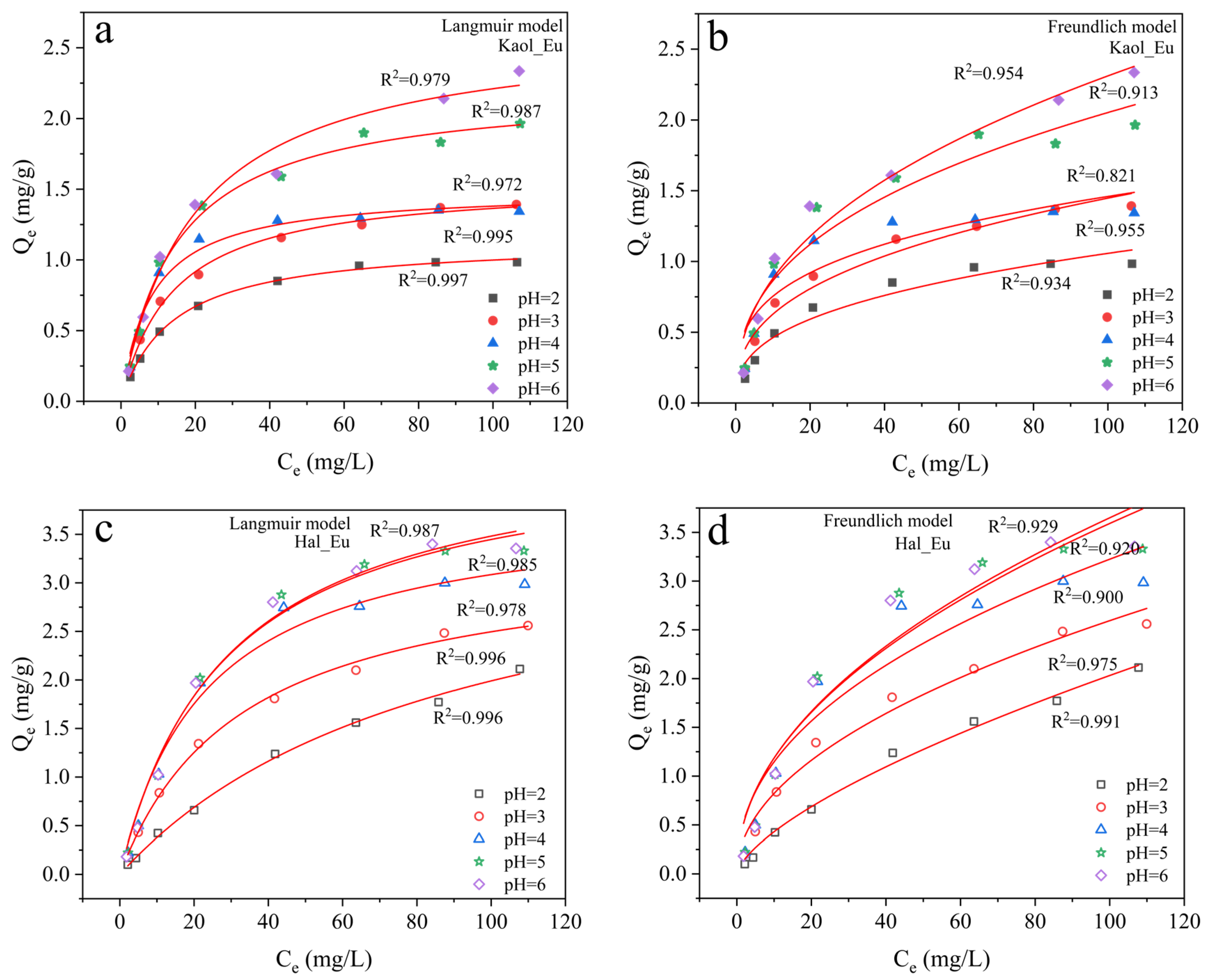 Isothermal adsorption curves fitted by the Langmuir model (a,c) and Freundlich model (b,d) for Eu3+ adsorption on kaolinite (a,b) and halloysite (c,d) at different pH values (2.0, 3.0, 4.0, 5.0, and 6.0).