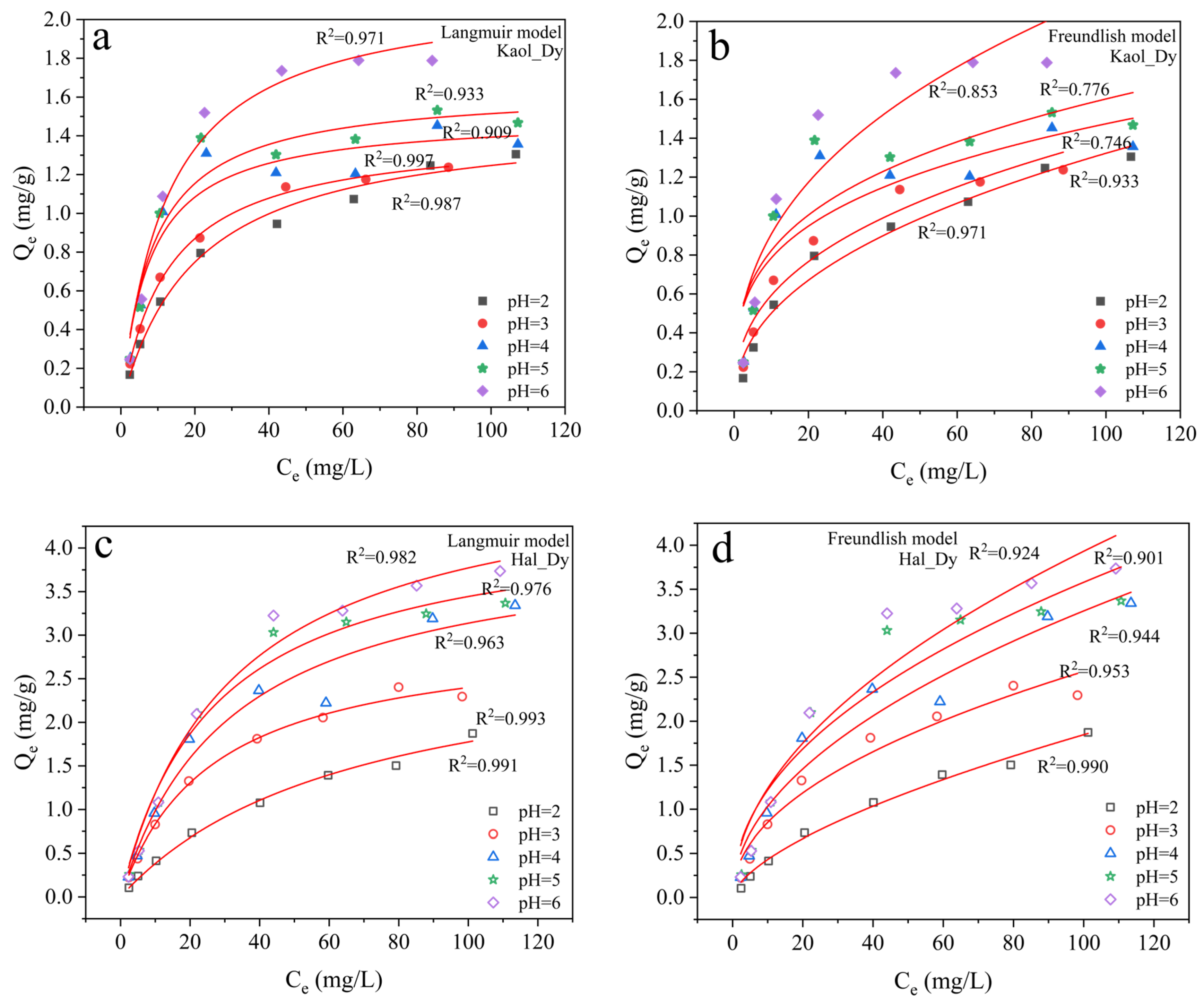 Isothermal adsorption curves fitted by the Langmuir model (a,c) and Freundlich model (b,d) for Dy3+ adsorption on kaolinite (a,b) and halloysite (c,d) at different pH values (2.0, 3.0, 4.0, 5.0, and 6.0).
