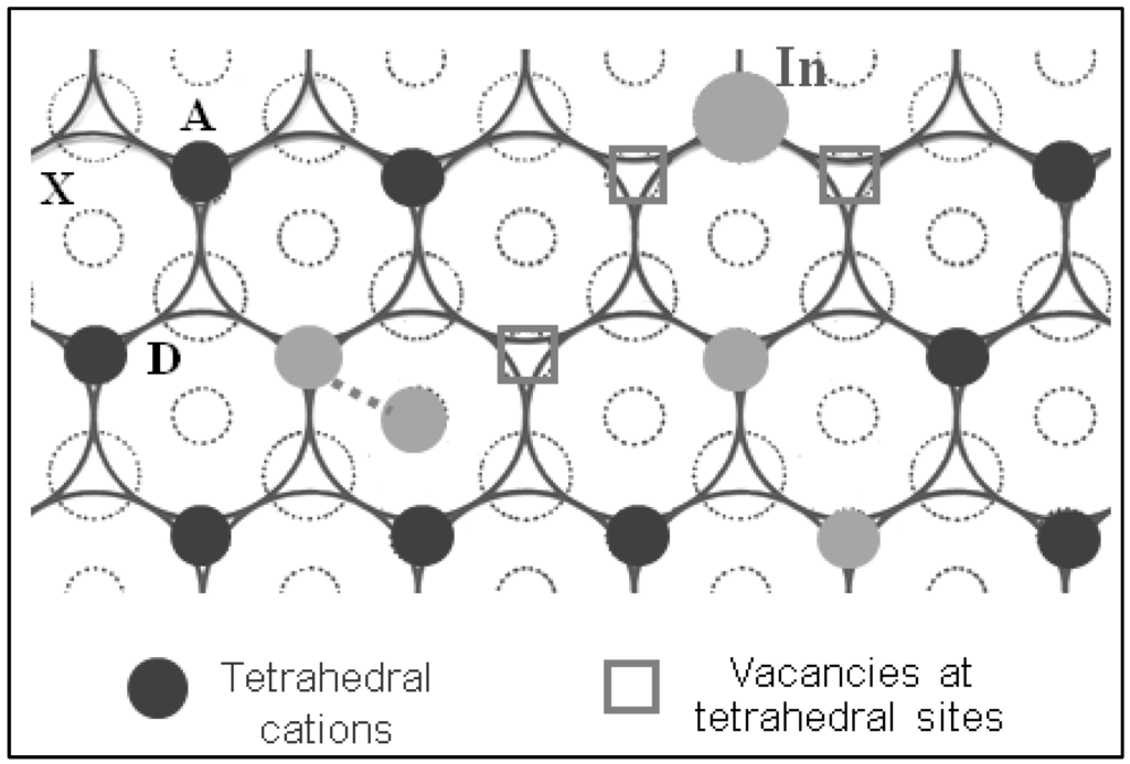 Condensed model sheet [15] figuring out the closest-packed layers of sulphur anions (X) in the crystal structureof “tetrahedral sulfides” where the cations fill half of the available tetrahedral sites (A) in the cubic closest packing of sulfur anions (X), leaving unoccupied the octahedral interstices (D). Insertion situations of indium are exemplified.