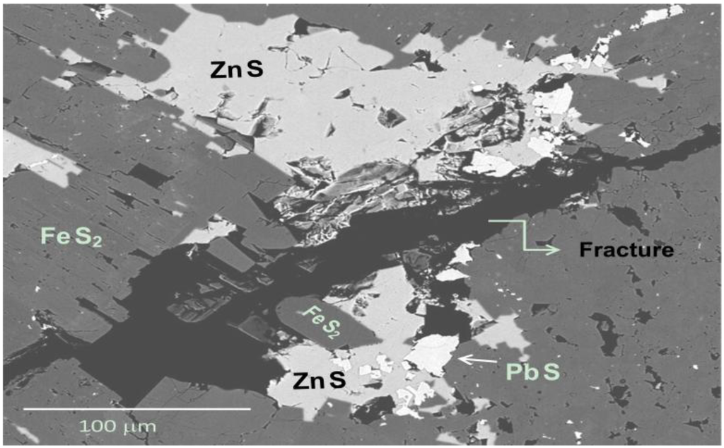 Photomicrograph of a polished section from ore sample LS 5-180.6 displaying the major constituting minerals: sphalerite (ZnS), pyrite (FeS2), galena (PbS).