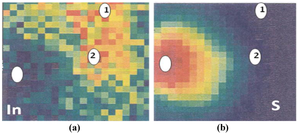 Topochemical map of a small area from a fragment of ore sample LS 5-180.6. Concentration of the selected element (a) In or (b) S: Red, maximum; blue, minimum. Points irradiated to collect In L3-edge XANES spectra are marked by ellipses.