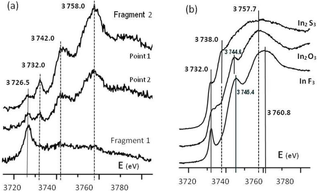 Compared with the details observed for the studied model compounds, all the spectra collected so far from chalcogenide ore samples display suchde tail at an energy that precedes the L3 absorption edge of indium metal (3730.1 eV). Curiously, in the In L3-edge XANES spectra collected from one ore fragment (Figure 5a, Fragment 1) only the pre-edge feature at 3726.5 eV could be clearly observed.