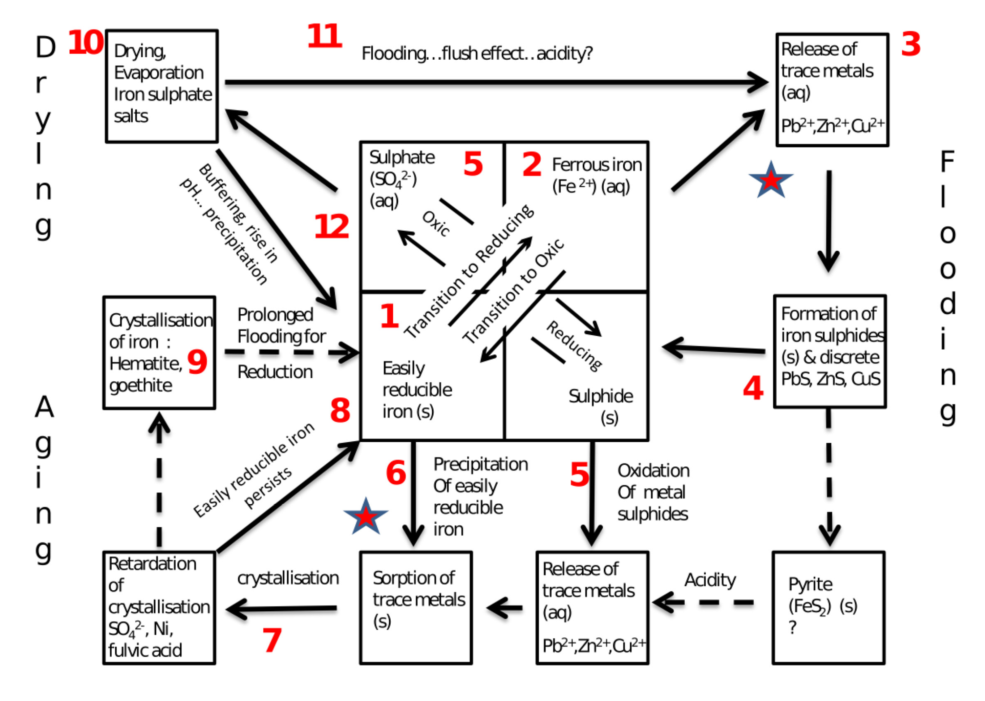 Simplified conceptual model to show changes in iron and sulphur species and effects on contaminant trace metal release in response to changes in redox potential and drying at different temporal scales. The red star indicates a process rate limited by the availability of easily reducible iron.