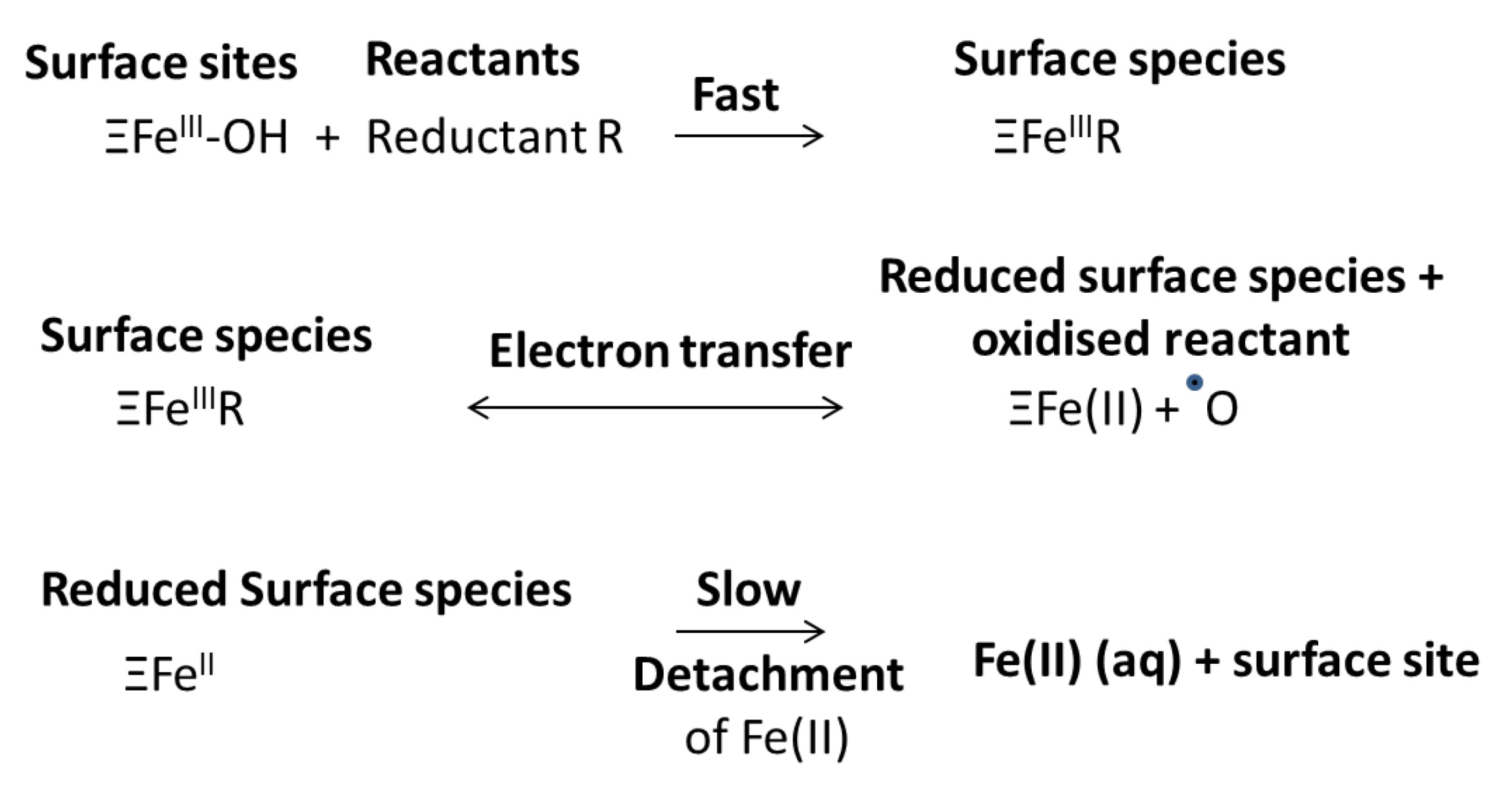Schematic of a typical redox reaction sequence between a reductant “R” and iron (III) (hydr)oxide, leading to the detachment and dissolution of ferrous iron. The electron transfer and the detachment process may both be rate determining [63]. This material is reproduced with permission of John Wiley & Sons, Inc (Hoboken, NJ, USA) [63].