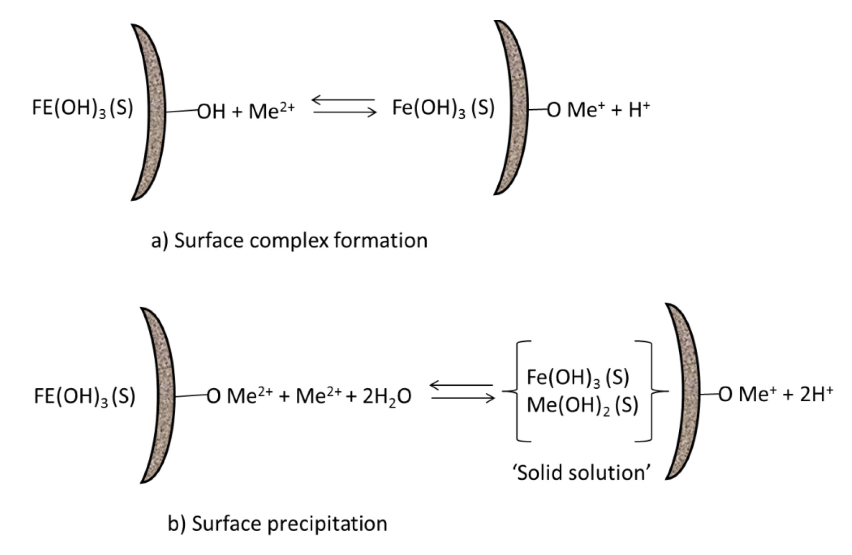 Schematic representation of surface complex formation (a) and surface precipitation (b) on hydrous ferric oxide (Fe(OH)3(S)). This material is reproduced with permission of John Wiley & Sons, Inc [63]. (a) At low surface coverage with Me2+, surface complex formation dominates. (b) With progressive surface coverage, surface precipitation may occur. The surface precipitate is looked at as a solid solution of Fe(OH)3(S) and Me(OH)2(S).