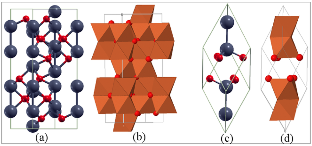 Figure 2. Schematic illustration of the (a) hexagonal unit cell and (c) the rhombohedral primitive cell of α-Fe2O3. The face-sharing octahedra in (a) and (c) are shown in (b) and (d) respectively. Color scheme: Fe = grey and O = red.