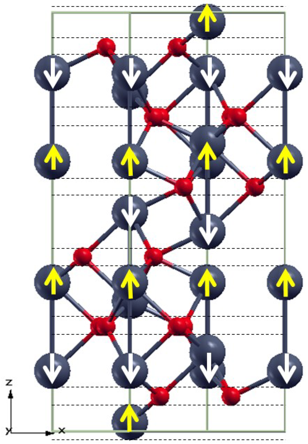 Figure 3. Hexagonal α-Fe2O3 lattice with anti-ferromagnetic spin arrangements indicated by up (yellow) and down (white) arrows at the Fe sites. Color scheme: Fe = grey and O = red.