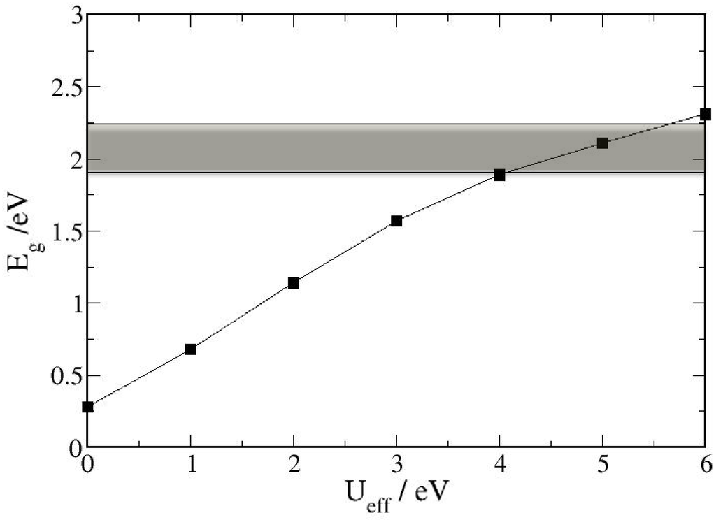 Figure 4. Electronic band-gap for α-Fe2O3 plotted against different U-values. The experimental band-gap range is indicated by the shaded area.