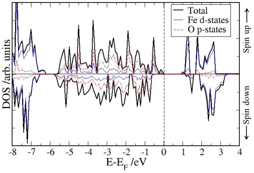In this study, the strong intra-atomic electronic correlations were accounted for by adopting the DFT-GGA+U approach, which adds an on-site Coulomb repulsion to the DFT Hamiltonian. We have tested different U-values and their implications for the electronic band-gap and Fe magnetic moment and found that U = 5.0 eV provides a good description of the band-gap (2.1 eV) and the Fe magnetic moment (4.23 μβ), which compares well with the experimental band-gap (1.9–2.2 eV) [134] and Fe magnetic moment (4.6–4.9 μβ) [135,136]. The calculated lattice parameters a = b = 5.024 Å and c = 13.658 Å are also in good agreement with experiment [1]. Rohrbach et al. [54] and Bandyopadhyay et al. [56] have also shown that the DFT+U method (U-value = 5 eV) provides a good description of the band-gap and magnetic moment of Fe in hematite and chromia (Cr2O3) and our calculated gap width and Fe magnetic moments compares very well with the results of other recent theoretical calculations [137,138]. In Figure 4, we show how the electronic band-gap increases with increasing strength of the on-site Coulomb repulsion, where U = 5 eV predicts the gap width (2.1 eV), which falls within the experimental range (shaded area). It is also evident from the density of states plotted at U = 5 eV (see Figure 5) that the occupied states near the Fermi level are mainly composed of the O 2p states with a small contribution of the Fe 3d states, in agreement with experimental measurements that show that hematite has the valence band edge dominated by the O 2p states [131,132,133]. The conduction band is dominated by Fe 3d states, suggesting that α-Fe2O3 is an O 2p → Fe 3d charge transfer insulator in agreement with the experimental evidence.