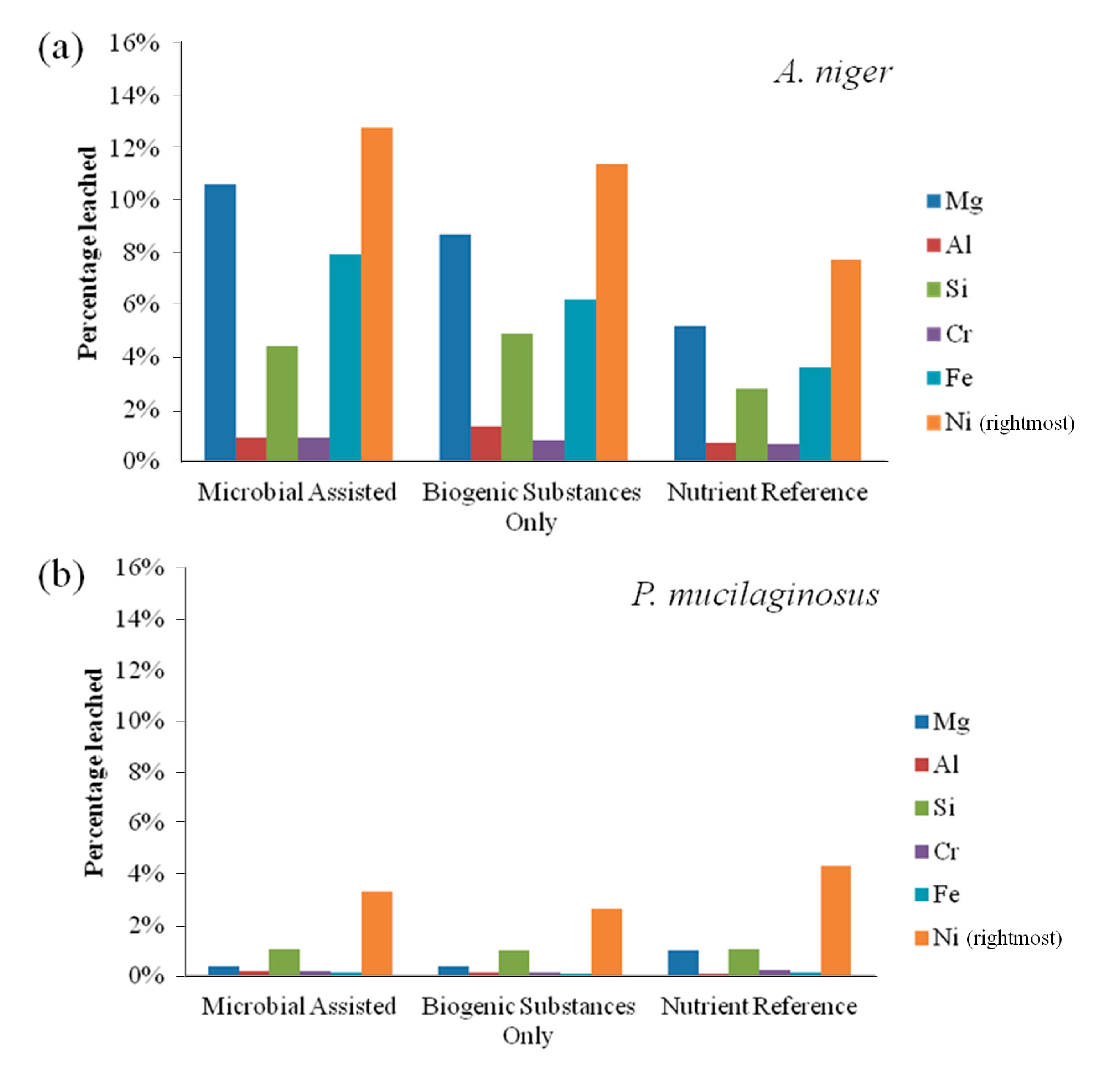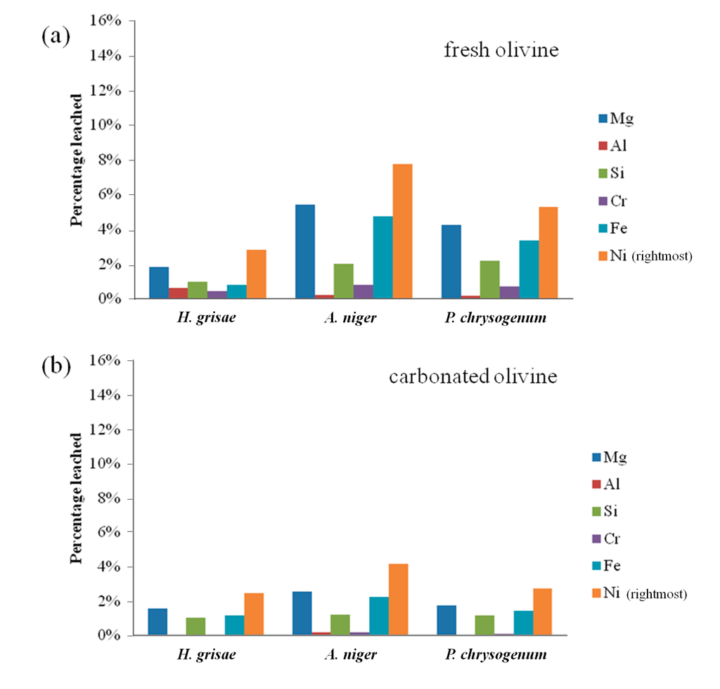 From Figure 1a, it also appears that live A. niger provides enhanced leaching compared to the experiment performed with sterile biogenic substances. Burgstaller and Schinner [10] have noted that cell-particle contact may contribute to the enhancement of fungal bioleaching, for example by stimulating biogenic acid production. Finally, it is notable from Figure 1 that elemental leaching was incongruent, with higher yields of nickel leaching compared to magnesium and iron, the two main constituents of olivine. Leaching of silicon was further reduced compared to these elements, as can be expected by the low solubility of silicic acid at these conditions, while chromium and aluminum remained largely unaffected, likely due to their presence primarily within metal-rich crystals [13] and their differing geochemical characteristics.