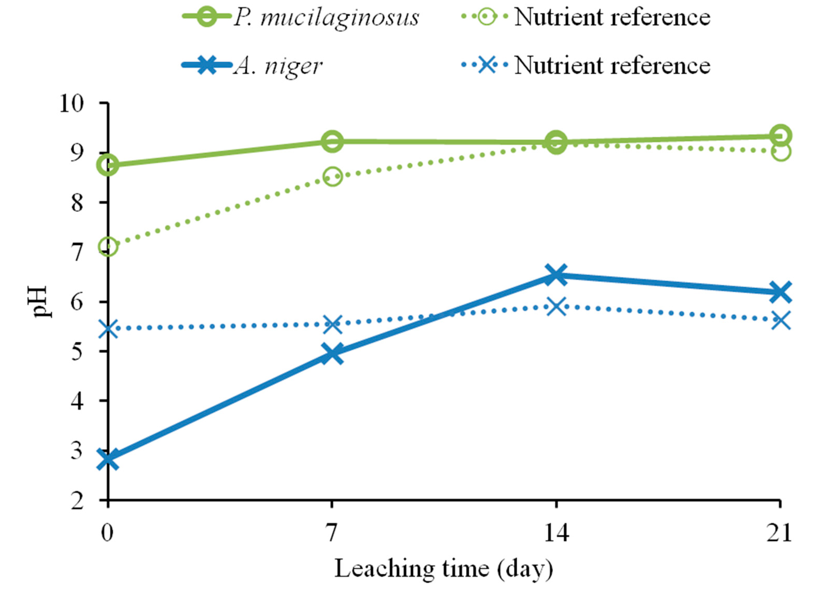 Variation of pH, measured weekly, during bioleaching of fresh olivine over 21 days by Aspergillus niger and Paenibacillus mucilaginosus and their respective nutrient broth references.