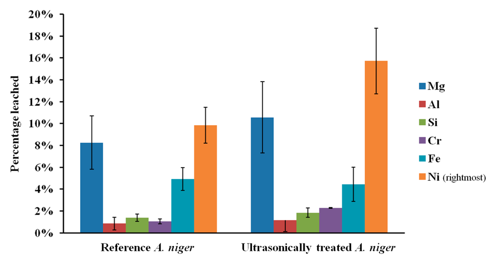 The influence of sonication on the leaching of fresh olivine by Aspergillus niger is shown in Figure 4. Treating the fungus both during the growth phase as well as during the leaching phase clearly enhanced the leaching. Nickel leaching after 17 days increased from 9.9% without ultrasonic conditioning to 15.7% with ultrasonic conditioning. This enhancement can be due to a wide combination of effects. One of the most important being that sonication increases the microbial growth, which will in turn lead to an increased production of biogenic substances [11]. Ultrasound can disrupt fungal pellets and cause the biomass to grow mainly as dispersed hyphae [15]; this affects the broth rheology, since solution viscosity depends on the morphology of the suspended biomass, and can promote the production of fungal metabolites that require freely dispersed fungal morphology. The latter effect was confirmed by pH measurements of the fungal broth at the end of the growth phase. The pH of the broth under standard conditions was 2.8, whereas the pH of ultrasonically treated broth was 2.3. Plating indicated a viable fungal concentration above 105 CFU/mL in both cases. The reduction in pH may be explained by an increase in the production of biogenic organic acids, as measured by Anjum et al. [11]. Yao et al. [9] pointed out, however, that pH effect is not the only driving force for the accelerated dissolution of minerals. Organic compounds other than acids can act as ligands to form surface or aqueous complexes; the formation of surface complexes can weaken the chemical bonds in the bulk material, leading to an accelerated elemental release.