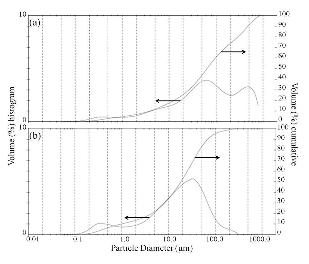 (a) Particle size distribution of fresh olivine after bioleaching with Aspergillus niger without ultrasonic conditioning; and (b) with ultrasonic conditioning.