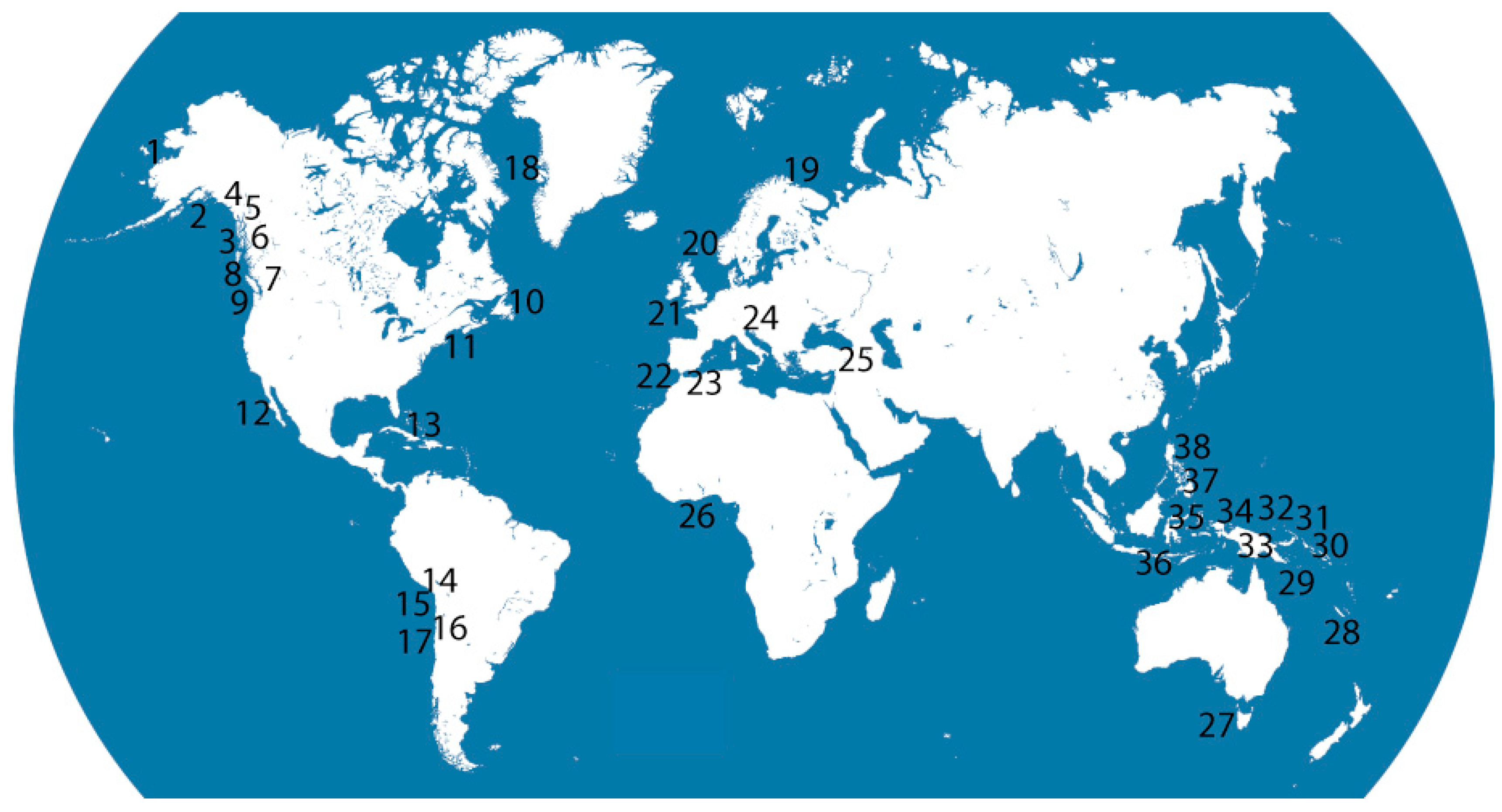 | 2. Prince William Sound, USA (Cu) | 21. St. Ives bay, Hayle estuary, England (Sn) |