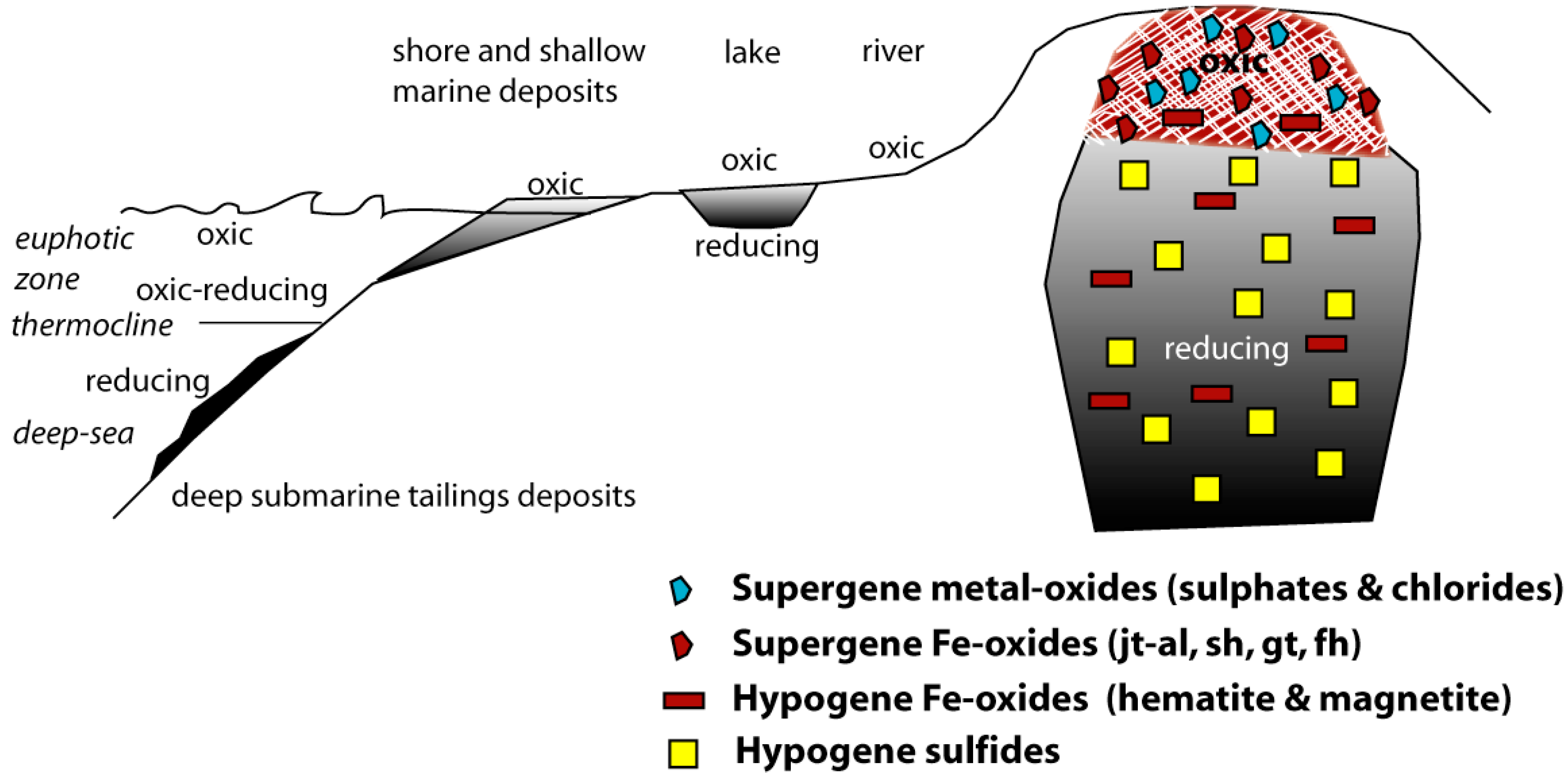 Schematic model of a sulphide ore deposit (porphyry), with the zones, where sulphides, oxides, and sulphates/chlorides may dominate the mineral assemblage. This zoning is a strong simplification and the different mineral groups may coexist. On the left, the different tailings disposal options in water bodies and their dominant geochemical regimes are highlighted.