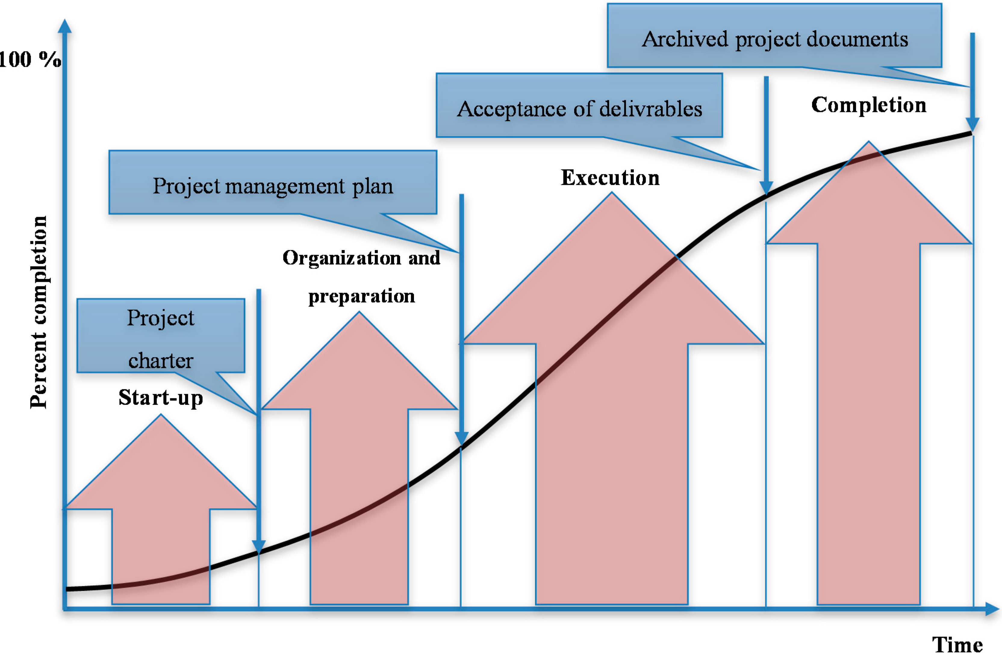 Figure 2 illustrates the lifecycle of a typical project comprising four phases: (1) start-up; (2) organization and preparation; (3) execution of the planned activities; and (4) completion.
