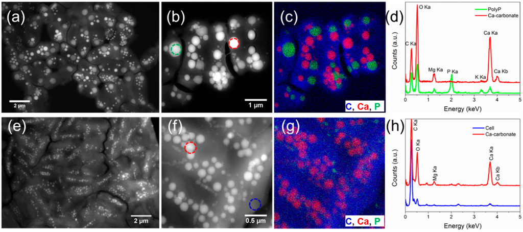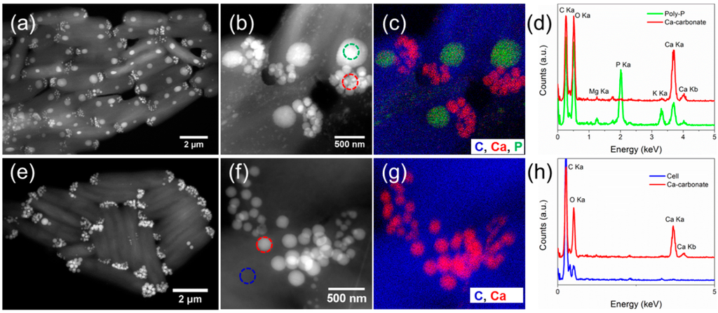(a,b) HAADF-STEM images of Ca. S. calcipolaris G9 cells grown in BG-11; (c) STEM-EDXS map of G9 cells (same area as in (b)); (d) EDX spectra extracted from Ca-carbonate (red line) and polyphosphate (green line) inclusions which are indicated by red and green dashed circles in image b, respectively; (e,f) HAADF-STEM images of G9 cells grown in MS-2; (g) STEM-EDXS map of G9 cells (same area in (f)); (h) EDX spectra extracted from Ca-carbonate (red line) and cytoplasm as a background (cell, blue line) which are indicated by red and blue dashed circles on image (f), respectively. In (c,g), each color in the elemental map corresponds to one element indicated by its own symbol with the same color.