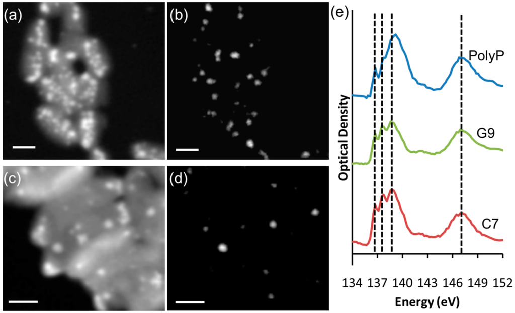 (a) STXM image at 136 eV of Ca. G. lithophora C7 cells grown in BG-11; (b) Corresponding map of phosphorus compounds absorbing at 136 eV (same area as in (a)). The map was obtained by subtracting an image at 132 eV from an image at 136 eV. Pixel size is 50 nm; (c) STXM image at 132 eV of Ca. S. calcipolaris G9 cells grown in BG-11; (d) Corresponding map of phosphorus compounds absorbing at 138 eV (same area). The map was obtained by subtracting an image at 132 eV from an image at 138 eV. Pixel size is 70 nm; (e) XANES spectra at the P L2,3-edges of reference polyphosphates (top), P-rich inclusions of G9 cells shown in (c) (middle), P-rich inclusions of C7 cells shown in (a) (bottom). Vertical lines are located at 136.7, 137.7, 139 and 146.8 eV. Scale bar is 1 µm for all images.