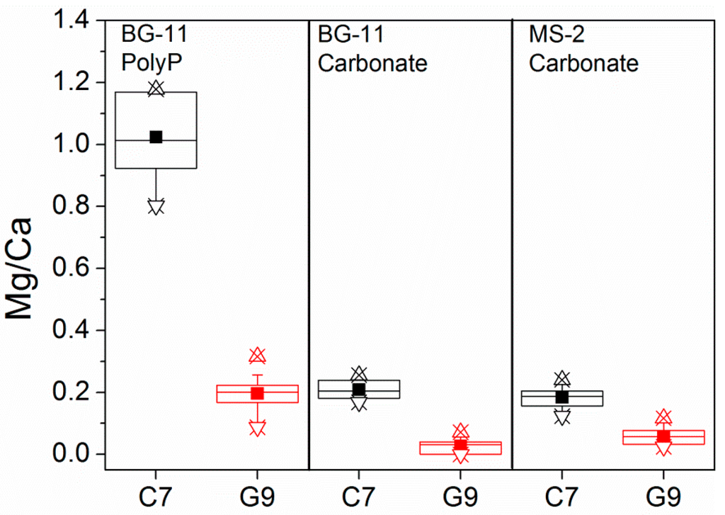 Box charts of atomic ratios of Mg/Ca of individual carbonate and polyphosphate (PolyP) inclusions of Ca. G. lithophora C7 and Ca. S. calcipolaris G9 cells grown in BG-11 and MS-2.