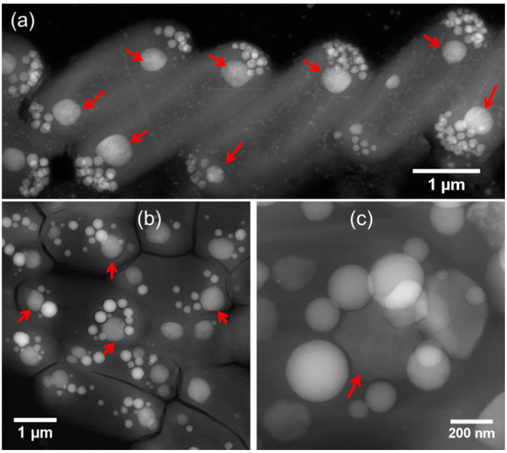 The cells not post-fixed by OsO4 were completely disrupted by the propylene oxide-1,2 treatment. In these samples, some spherical particles were observed by HAADF-STEM (Figure 11d). They were very different chemically from polyphosphate, carbonate and phosphate inclusions, with no Ca and P and only C and O and traces of Al (Figure 11d,i). In contrast, cells post-fixed by OsO4 were preserved after the 1,2-propylene oxide treatment. However, calcium phosphate inclusions formed during OsO4 post fixation and ethanol dehydration, dissolved and calcium was completely lost.