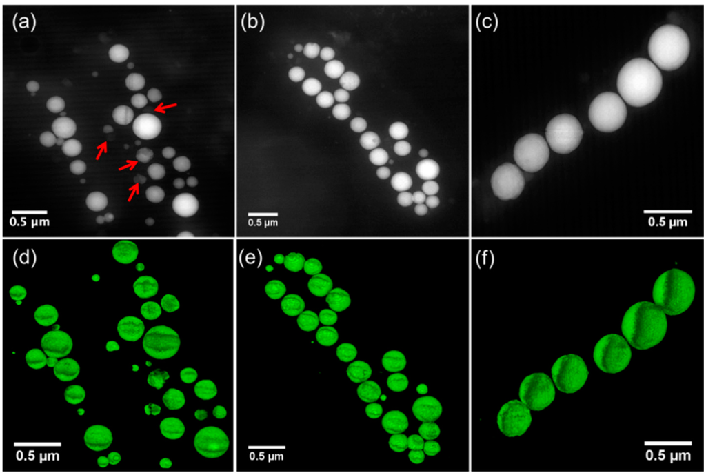 Bright-field TEM and HAADF-STEM tomography experiments were performed at 200 kV accelerating voltage on a JEOL-2100 microscope equipped with a LaB6 gun and on a Tecnai F20 microscope (FEI Company, Hillsboro, OR, USA) equipped with a Shottky field emission gun, respectively. Tomographic tilt series were obtained at ±70° with 2° intervals in the Saxton mode. Images at each angular increment were recorded by a 1024 × 1024 pixel Ultrascan cooled CCD detector (Gatan) for bright-field TEM images and with a Gatan 777 HAADF-STEM detector. The acquisition was performed using the Gatan Tomography package running under GMS1.8.5. Tomograms were reconstructed using the IMOD software package (University of Colorado, Boulder, CO, USA) or DIGIECT software [].