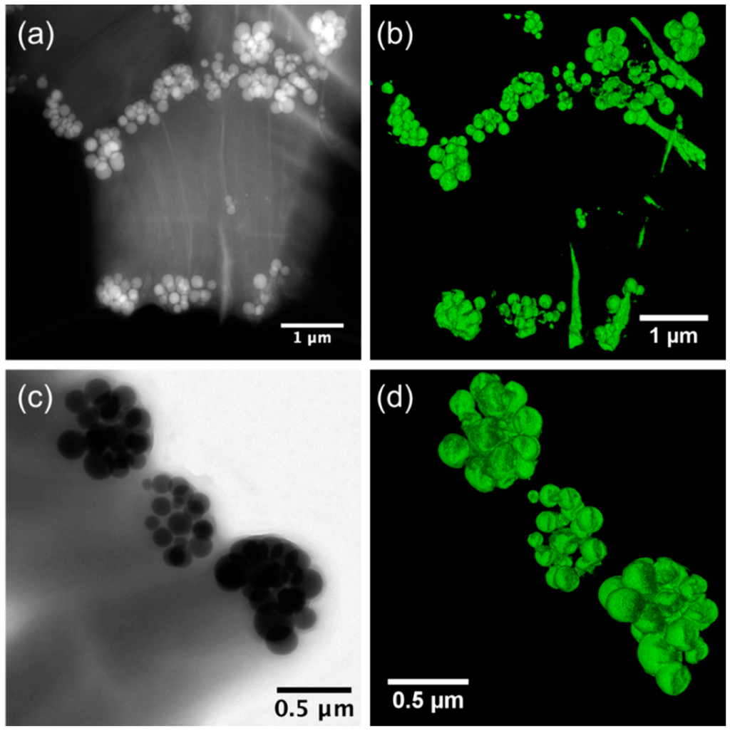 HAADF-STEM (a,b) and TEM (c,d) tomography of Ca. S. calcipolaris G9. (a) HAADF-STEM image of several G9 cells selected for tilt series acquisition and tomographic reconstruction; (b) 3-D visualization of the reconstruction from carbonate inclusions showing in (a); (c) Bright-field TEM image of part of three G9 cells selected for title series acquisition tomographic reconstruction; (d) 3-D visualization of the reconstruction from carbonate inclusions showing in (c).