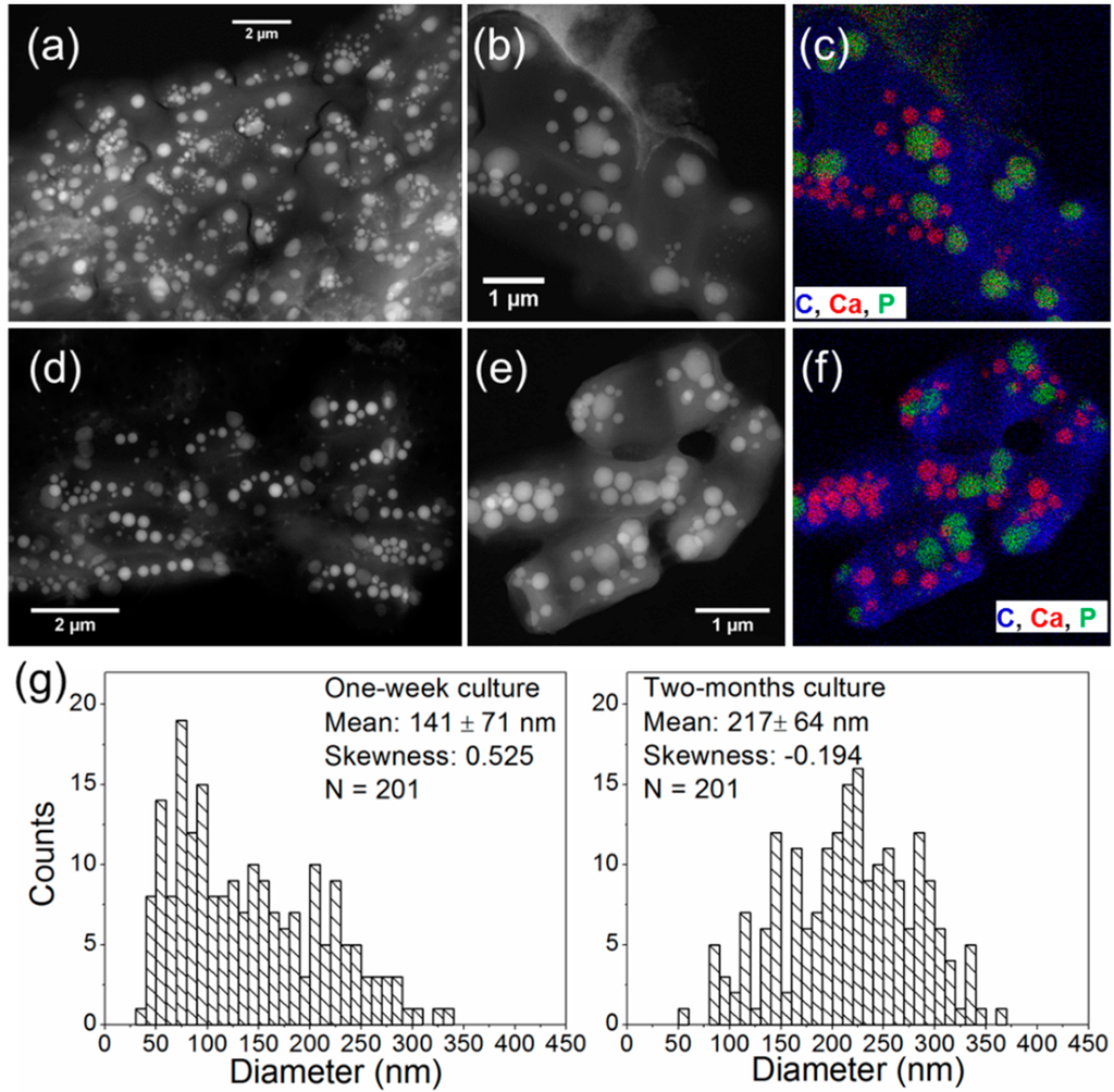 HAADF-STEM images and STEM-EDXS maps of Ca. G. lithophora C7 cells grown in BG-11 for one week (a–c) or two months (d–f). (a,d) show low-magnification HAADF-STEM images of tens of cells; (b,e) show high-magnification HAADF-STEM images of several cells which were analyzed by EDXS mapping; (c,f) show overlaid elemental maps where each color corresponds to one element indicated by its own symbol with the same color; (g) Particle size distributions of carbonate inclusions grown for one week (left panel) and two months (right panel).