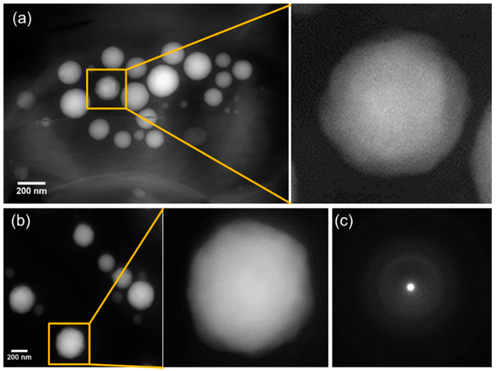 In addition, many of the Ca-carbonate inclusions appeared spherical. However, some inclusions showed facets (Figure 9). Zero-loss filtered selected area electron diffraction (SAED) study shows that such Ca-carbonate inclusions are also electron diffraction amorphous.