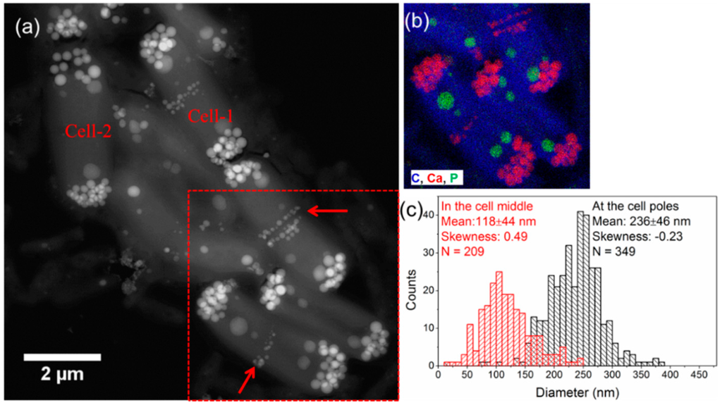 Interestingly, the time-evolution of the particle size distribution evidenced for Ca. G. lithophora C7 was also observed for the carbonate inclusions located at the septum and cell poles of Ca. S. calcipolaris G9 cells. As shown in Figure 10, carbonate inclusions at the septum had a positive diameter distribution (skewness of 0.49), while the carbonates at the cell poles had a negative distribution (skewness is −0.23). Correspondingly, the mean diameter value of carbonates was 118 ± 44 nm and 236 ± 46 nm for carbonate inclusions at the septum and at the cell poles, respectively. It should be noted that some cells have carbonate inclusions with the same size at their two poles (e.g., Cell-1 in Figure 10a), while others have inclusions with different sizes at the poles (e.g., Cell-2 in Figure 10a).