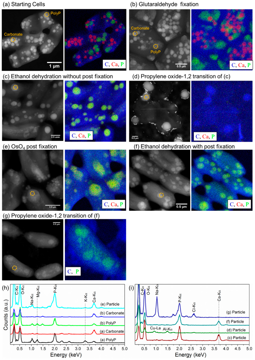 Chemical alterations of carbonate inclusions within Ca. G. lithophora C7 during ultramicrotomy sample preparation. (a) Starting Ca. G. lithophora C7 cells; (b) Cells after glutaraldehyde fixation; (c) Cells after ethanol dehydration (from 50% to 100%) without osmium tetroxide (OsO4) post fixation; (d) Cell debris after 1,2-propylene oxide treatment without OsO4 post fixation; (e) Cells after OsO4 post fixation; (f) Cells after ethanol (from 50% to 100%) dehydration with OsO4 post fixation; (g) Cells after 1,2-propylene oxide treatment with OsO4 post fixation; (h) EDX spectra showing chemical alteration of polyphosphate (polyP) and carbonate inclusions after glutaraldehyde fixation and OsO4 post fixation; (i) EDX spectra showing chemical alterations of intracellular particles after ethanol dehydration and 1,2-propylene oxide treatment. In each panel, the left image was obtained by HAADF-STEM, and the right image corresponds to a STEM-EDXS map. The dashed circles in the HAADF-STEM images indicate the areas from which the EDX spectra were extracted in (h,i).