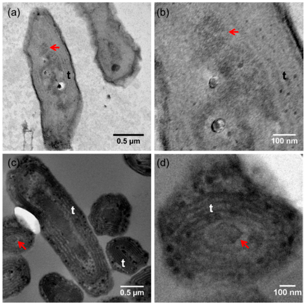 Bright-field TEM image of ultramicrotomy thin section of strain Ca. G. lithophora C7 (a,b) and strain Ca. S. calcipolaris G9 (c,d). The red-line arrows indicate possible carboxysomes. t thylakoid membranes.