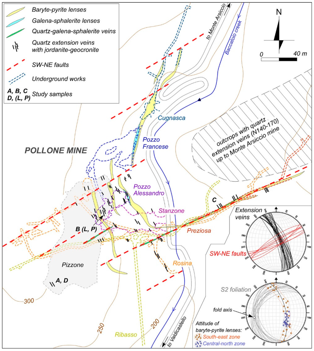 Schematic map of the Pollone mine, showing the main geological and structural features discussed in the text. Mining stopes and location of study samples are also reported.