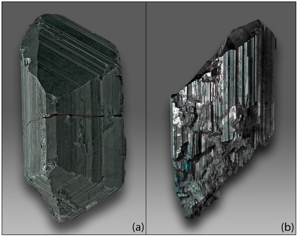 Crystals of members of the jordanite–geocronite series from the Pollone mine: (a) Historical specimen #14798, Natural History Museum, University of Pisa. Crystal size: 12 cm × 7 cm; and (b) Tabular deeply striated crystal (8 mm in size) from Type-1 occurrence. Private collection.