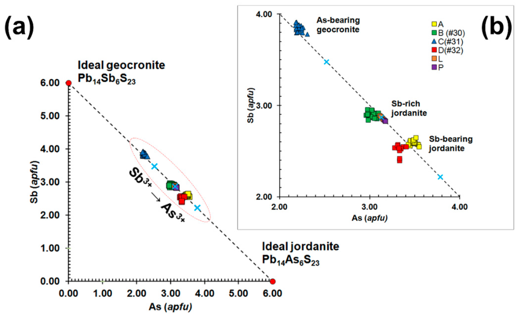 Chemical variability of jordanite–geocronite samples from the Pollone mine: (a) The chemical range of the studied specimens in the framework of the jordanite–geocronite series; and (b) A closer view of this range, showing the three different chemical compositions. Labels as in Table 2. Light blue crosses indicate the compositions obtained through structure refinement.