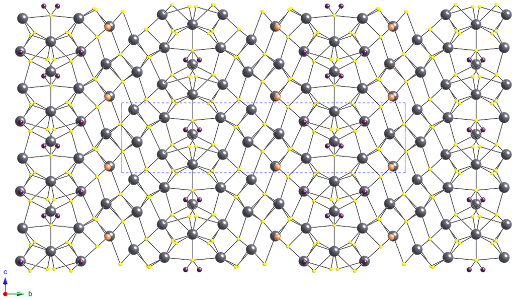 Crystal structure of members of the jordanite–geocronite series. Circles: lead grey = Pb sites; orange = Sb and (Sb, As) sites; violet = As and (As, Sb) sites; yellow = S sites.
