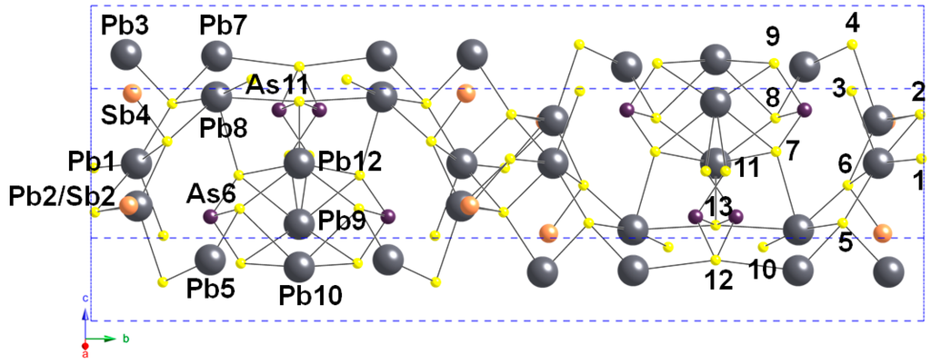 Twelve cation and thirteen anion sites occur in the crystal structure of jordanite and geocronite (Figure 5).