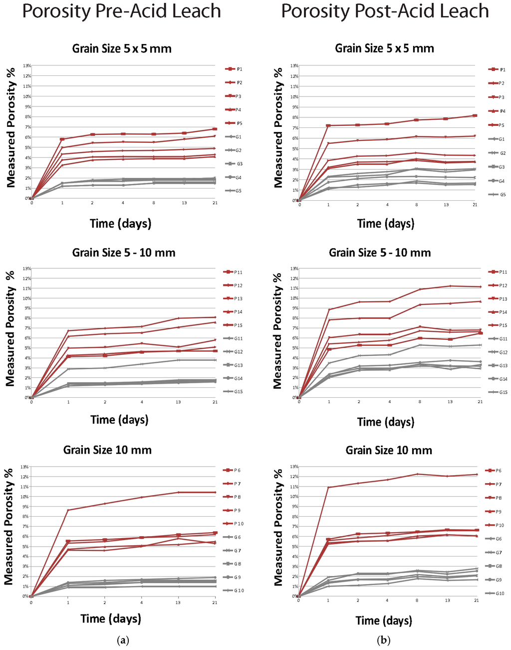 Estimated porosity measurements: (a) Pre-acid leach experiments; (b) Post-acid leach experiments. Red lines = pink samples; Gray lines = gray samples.