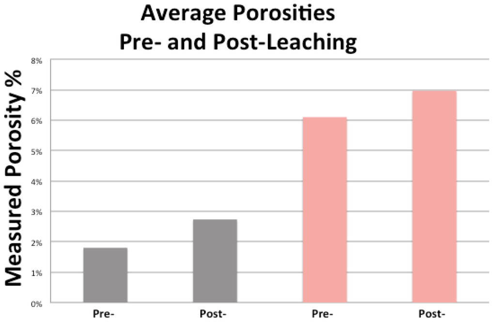 Average (15 samples per color) porosity pre- and post-leaching, showing an increase in porosity after sulfuric acid dissolution. Gray bars represent gray samples; red bars represent pink samples.