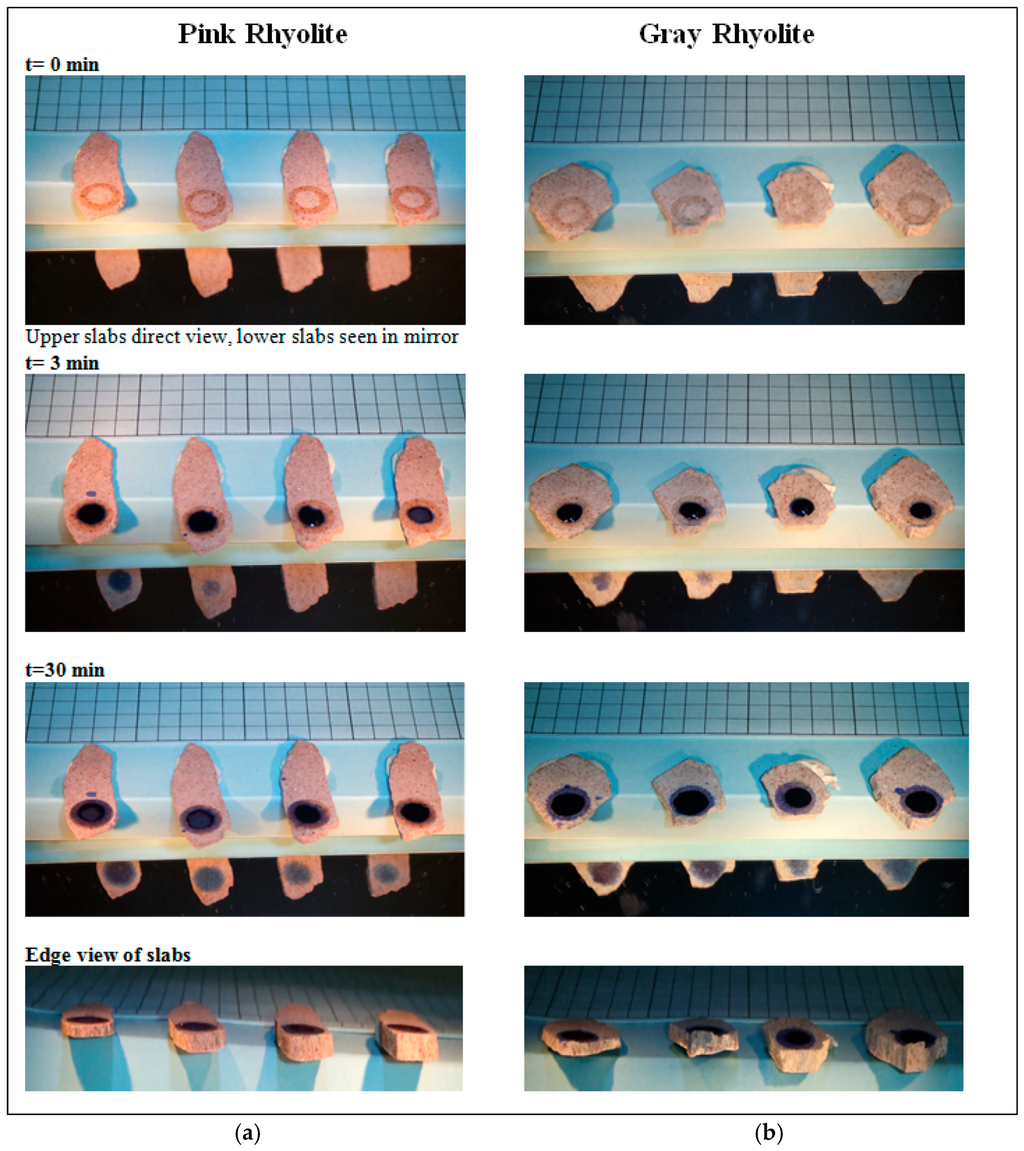In general, the pink variety of rhyolites exhibited more favorable permeability than the gray rhyolite. This was particularly noticeable in tests of the thicker slabs (5 to 10 mm). Pink specimens typically required 6 to 24 h for breakthrough, whereas the grays required as long as three days for penetration.