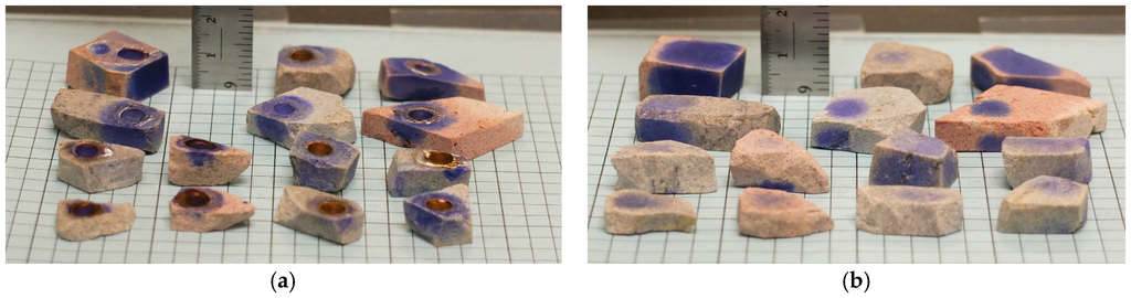 (a) Top surface of thick slabs with ink dimples; (b) Bottom surface of slabs showing ink breakthrough. Exposure times from six hours to three days. Top row of samples, left to right: pink, gray pink; Second row: gray, gray pink; Third row: gray, pink, gray, gray; Bottom row: gray, pink, gray, gray.