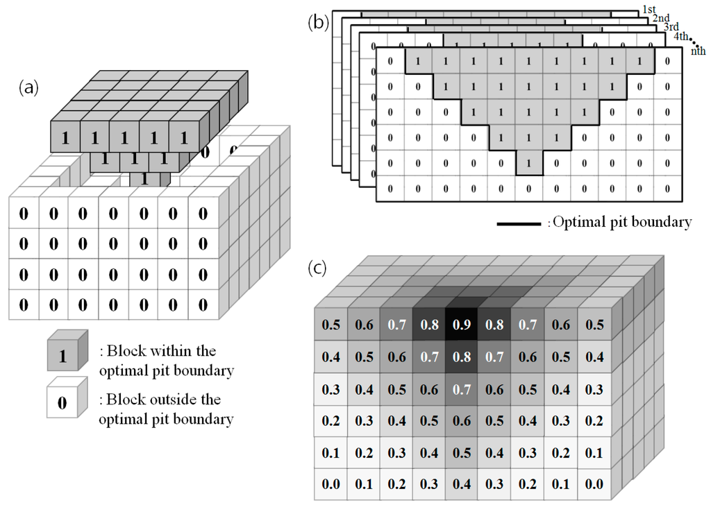 Here, Z denotes the probability that a block exists within the open pit optimal boundary (0.0–1.0), and denotes the binarized value assigned to the result of i-th open pit optimal boundary analysis. Z should be calculated for all blocks.