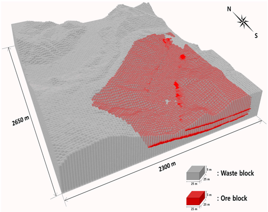 Determination of optimal open pit boundary is extremely important in planning an open pit mine. This is because profitability may vary significantly depending on the determination of open pit boundary. Algorithms to solve the open pit optimization problem have been developed by many researchers. Lerchs and Grossmann [1] developed an open pit optimization algorithm based on graph theory. In 1968, Johnson proposed the method to determine optimized pit boundary using network flow algorithm, which was verified by Picard [2]. David et al. [3] developed the Korobov algorithm, and Lane [4] introduced the concept of cut-off grade to the open pit optimization problem. Caccetta and Giannini [5] presented a dynamic programming method to implement the Lerchs and Grossmann algorithm. Berlanga et al. [6] developed the floating cone algorithm that can optimize open pit boundaries based on heuristic theory. Zhao and Kim [7] modified the Lerchs and Grossmann algorithm to take into account the boundary of ore and waste. Dowd and Onur [8] modified the Korobov algorithm to overcome its limitations, and Yamatomi et al. [9] presented an improvement plan for the floating cone algorithm. Underwood and Tolwinsk [10] developed an improved network flow algorithm, and Hochbaum and Chen [11] suggested the push-label algorithm by modifying the Lerchs and Grossmann algorithm. In addition, there have been many studies to solve the production scheduling optimization problems in open pit mines [12,13,14,15,16,17,18,19,20,21,22,23,24,25,26,27,28,29].