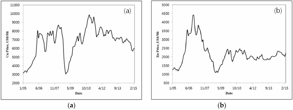 To examine the variation in metal prices, the data on copper and zinc prices for about 10 years (January 2005–April 2015) published by the London Metal Exchange (LME) were collected and analyzed (Figure 4). The results showed that the mean copper price for the past 10 years is 6796 $/tonne, the maximum price was 10,148 $/tonne, and the minimum price was 2770 $/tonne. In the case of zinc, the mean price for the past 10 years was 2109 $/tonne, the maximum price was 4620 $/tonne, and the minimum price was 1042 $/tonne.