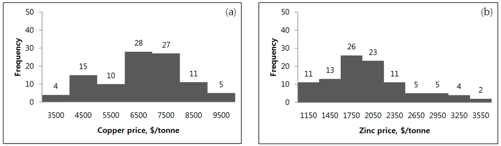 Results from Monte Carlo simulations. (a) Histogram of randomly extracted copper prices; (b) Histogram of randomly extracted zinc prices.