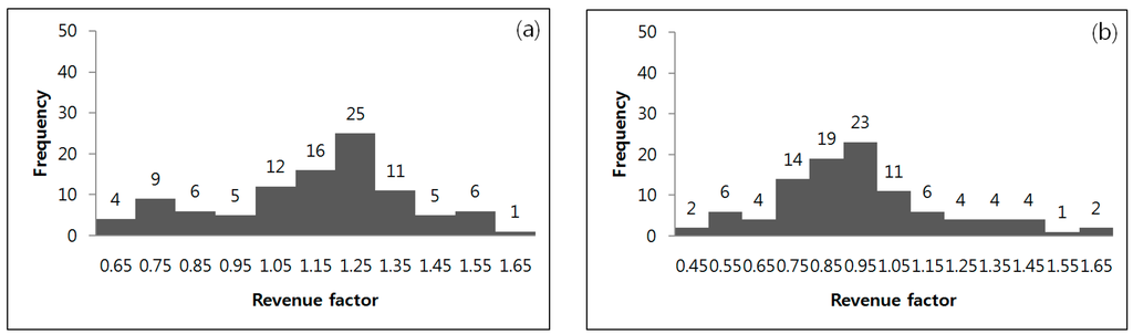 By entering the generated copper prices and zinc prices in Equation (6), RF was estimated. For the reference price for the minerals, the monthly average copper price of 6027.96 $/tonne and monthly average zinc price of 2206.90 $/tonne, published by LME for April 2015 when this study was conducted, were used. As the numbers of previously generated copper prices and zinc prices were 100 each, 100 RF values were also estimated for each. Figure 7 shows the estimated RFs of copper and zinc represented in the histogram.